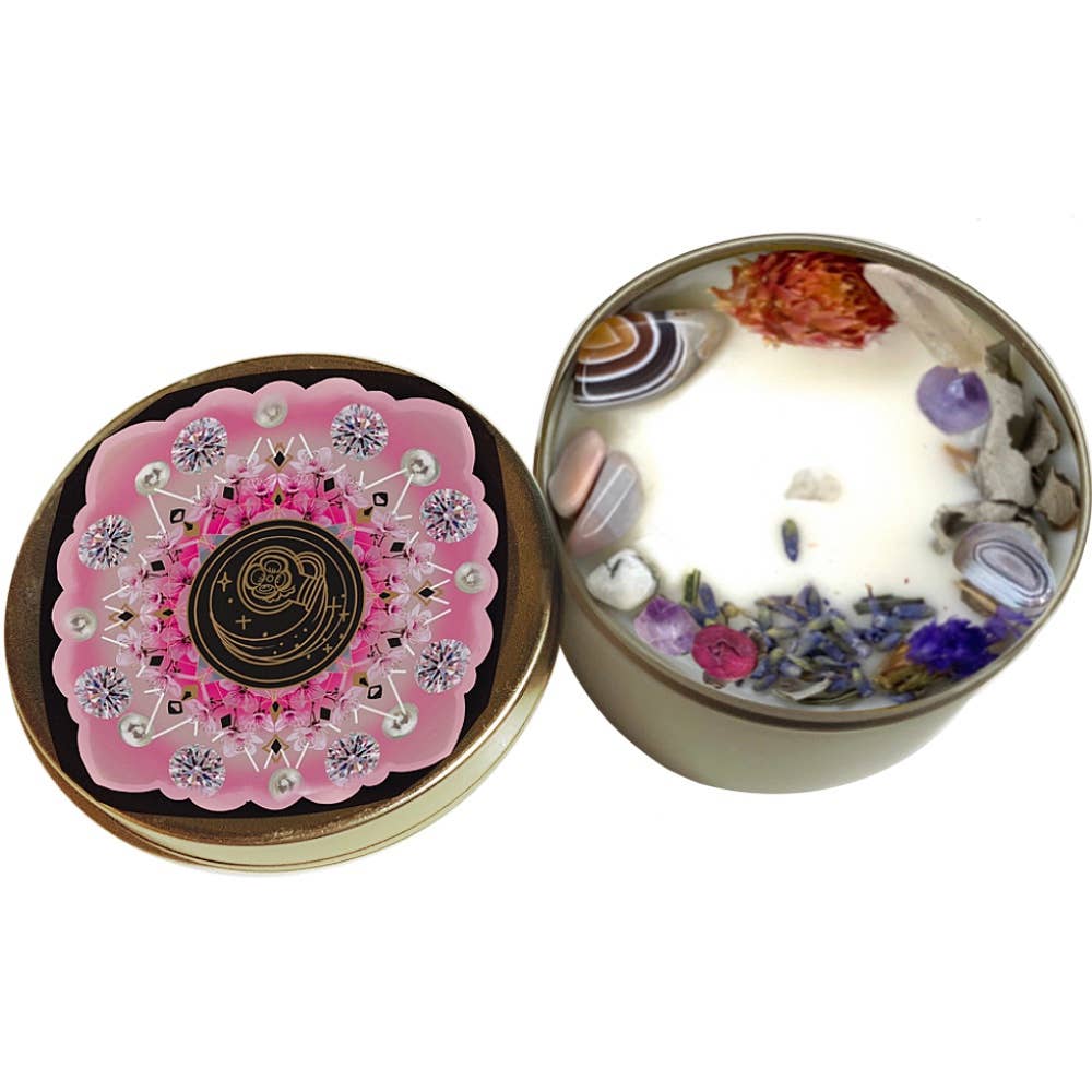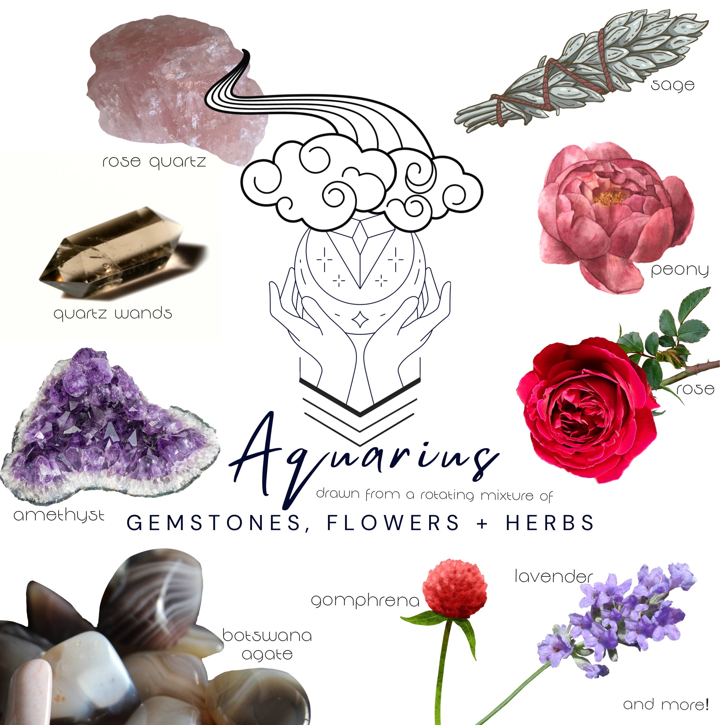 Rose petals, sage, lavender buds and Reiki charged crystals top off each special candle. We draw from a rotating mixture of genuine gemstones and minerals, intuitively chosen for Aquarius, including Quartz wands, Rose Quartz, Tiger’s Eye, Rhodochrosite, Jade, Amethyst and pieces of Druzy Geode.