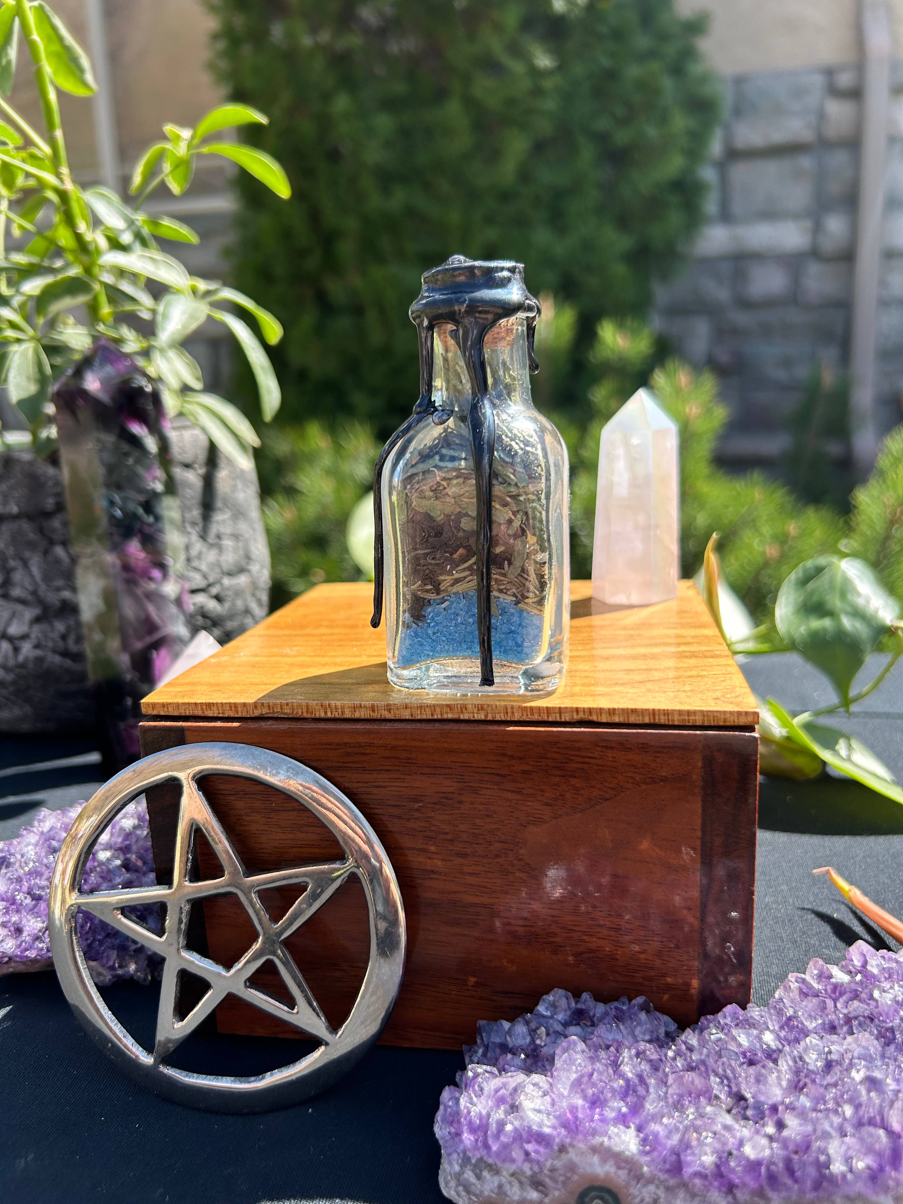 Each Spell Jar may vary slightly because each is handmade. Each bottle is hand sealed with wax so color may vary slightly from picture. Jars have a sealed cork and removable labels.