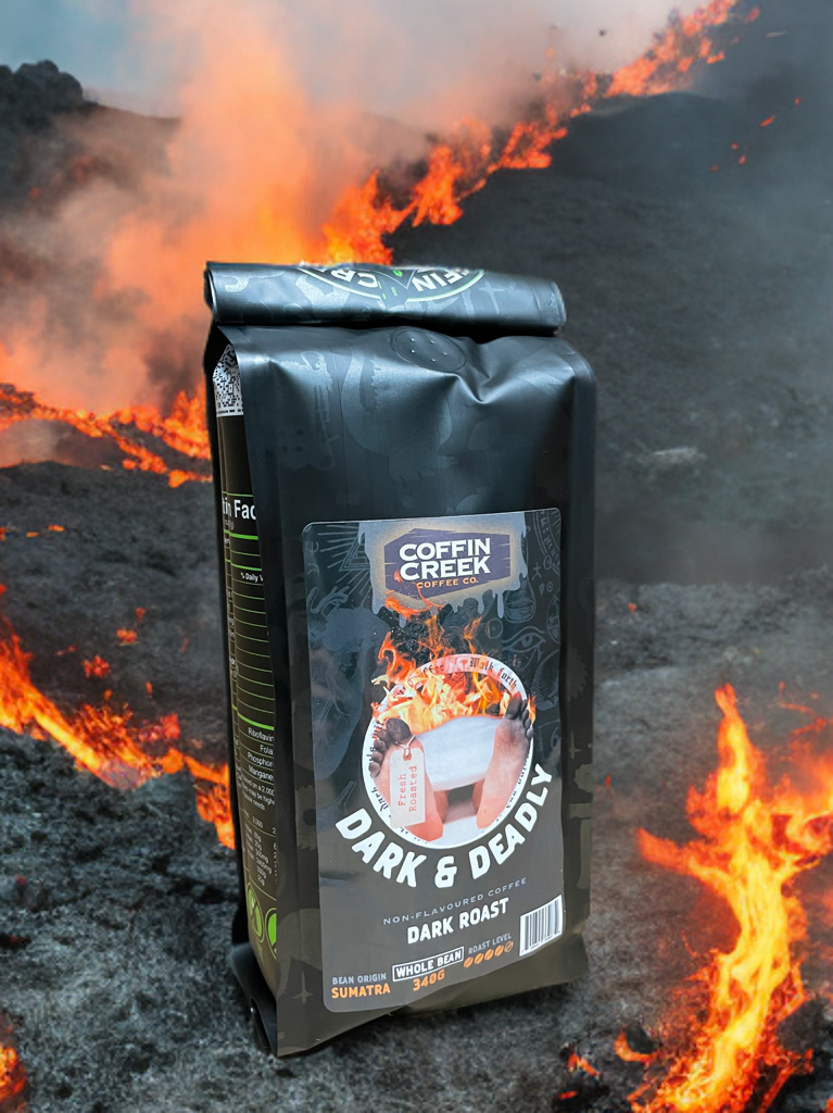 Dive into the depths of flavor with our dark roast Sumatra, a bold brew that captures the mysterious essence of Indonesia’s lush landscapes. This full-bodied coffee boasts rich, earthy flavors with dark chocolate and herbal notes. Its velvety texture and low acidity create a smooth, lingering finish that’s as haunting as a foggy night in Coffin Creek. Perfect for those who crave a robust cup, this Sumatra is a dark roast that packs a punch, offering a complex and satisfying coffee experience. Sip carefully—it’s got a kick!