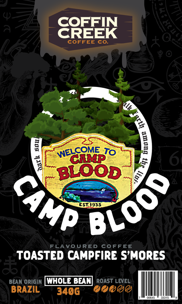 Decaf Camp Blood brings the ultimate campfire s'mores experience to your cup, blending the nostalgic flavors of rich chocolate, gooey marshmallow, and a hint of graham cracker without the caffeine. This bold brew captures the essence of toasting marshmallows over a flickering fire, making it the perfect companion for cozy nights or early mornings. With Camp Blood, every sip is a sweet, spooky trip to the campfire without the horror of cleanup!