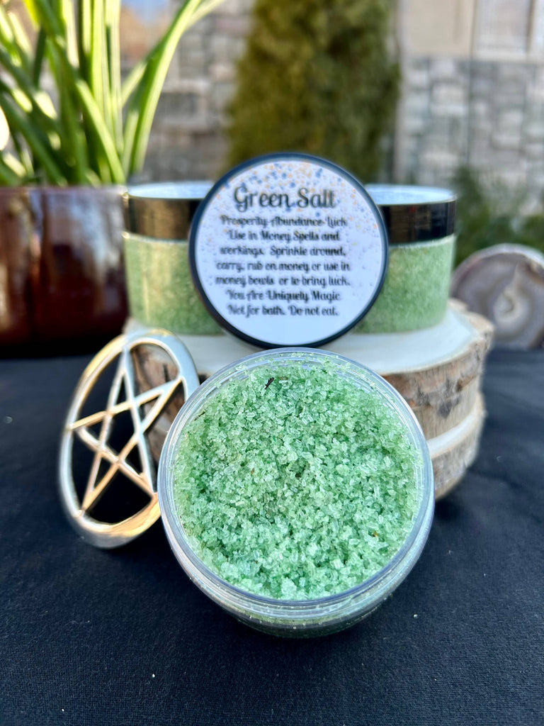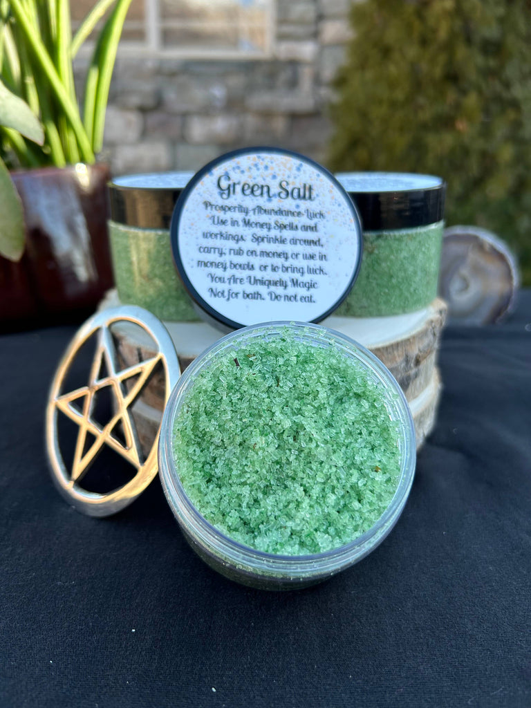 This handmade Green Witches Salt is used in Prosperity and Abundance Spells, Use in Spell Jars, Money Bowls or sprinkle in and around objects to cleanse them and bring abundance.