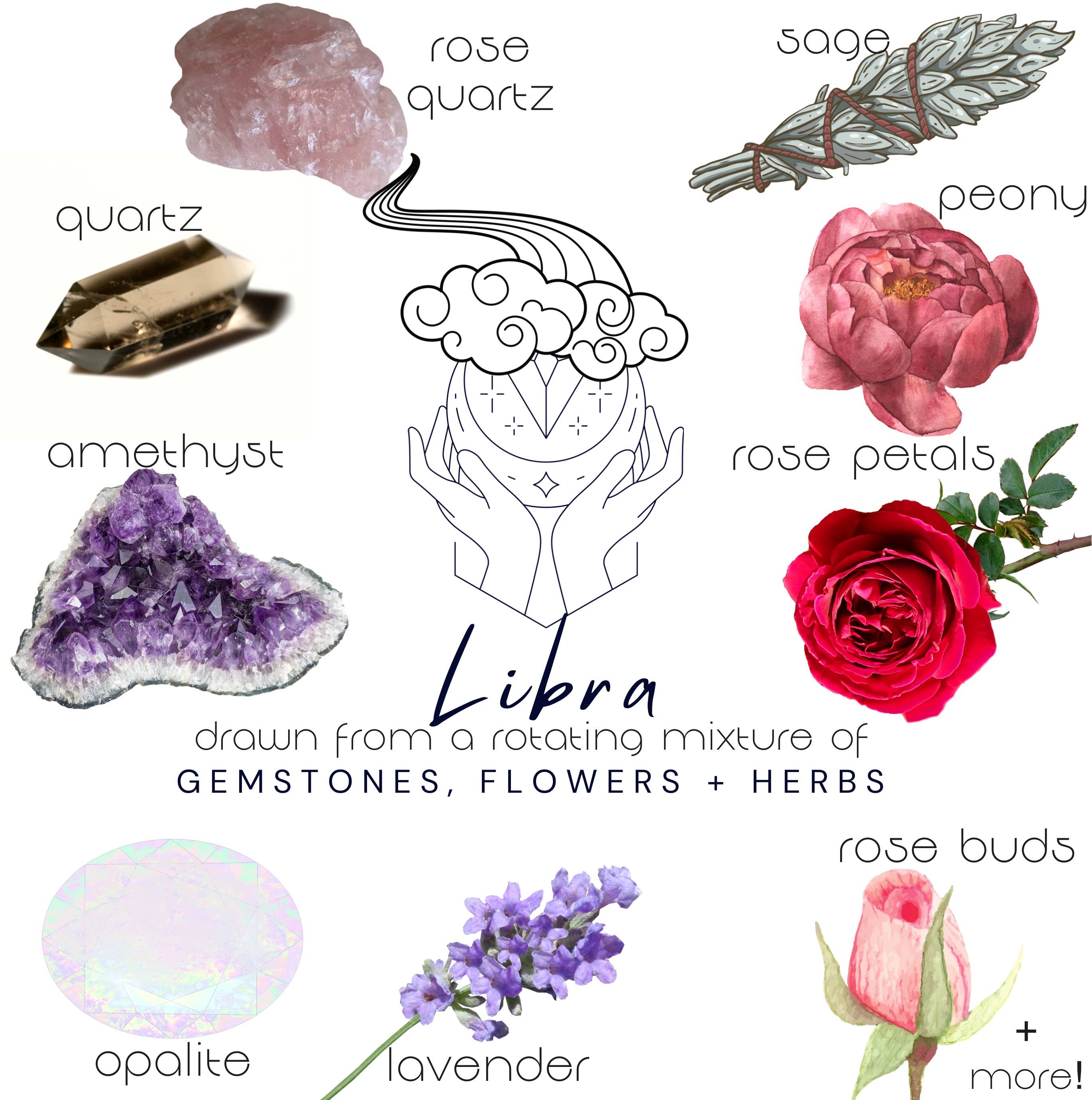 These special Libra crystal aromatherapy candles are a thoughtful gift for any occasion. Now available in 2 sizes- Small 4oz travel tin or 8oz Full size tin. Our candles are handpoured with organic soy candle wax and a blend of grade A therapeutic essential oils, featuring our Air Aromatherapy blend- Air: Palo Santo + Cedar w/ Rose + Sandalwood Note Profile: Top: Cardamom, Citrus, Bergamot Middle: Palo Santo, Balsam, Cedar, Rose, Saffron Base: Sandalwood, Amber, Pine, Juniper, Moss, Patchouli Rose petals, Sage, Lavender buds and Reiki charged crystals top off each special candle. We draw from a rotating mixture of gemstones and minerals, intuitively chosen for Libra, including Quartz wands, Opalite, Rose Quartz, Tiger’s Eye, Botswana Agate, Rhodochrosite, Amethyst and pieces of Druzy Geode. The cap closure of the candle is adorned with a label featuring original Libra art completed by Melodia in 2020. All of our candle wax is melted using renewable solar energy. <3