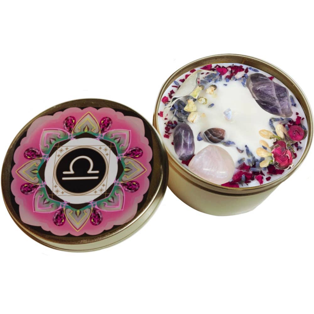 Libra Crystal Candle, Zodiac Candle w/ Gemstones + Herbs: 4 oz. travel tin