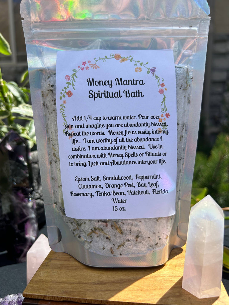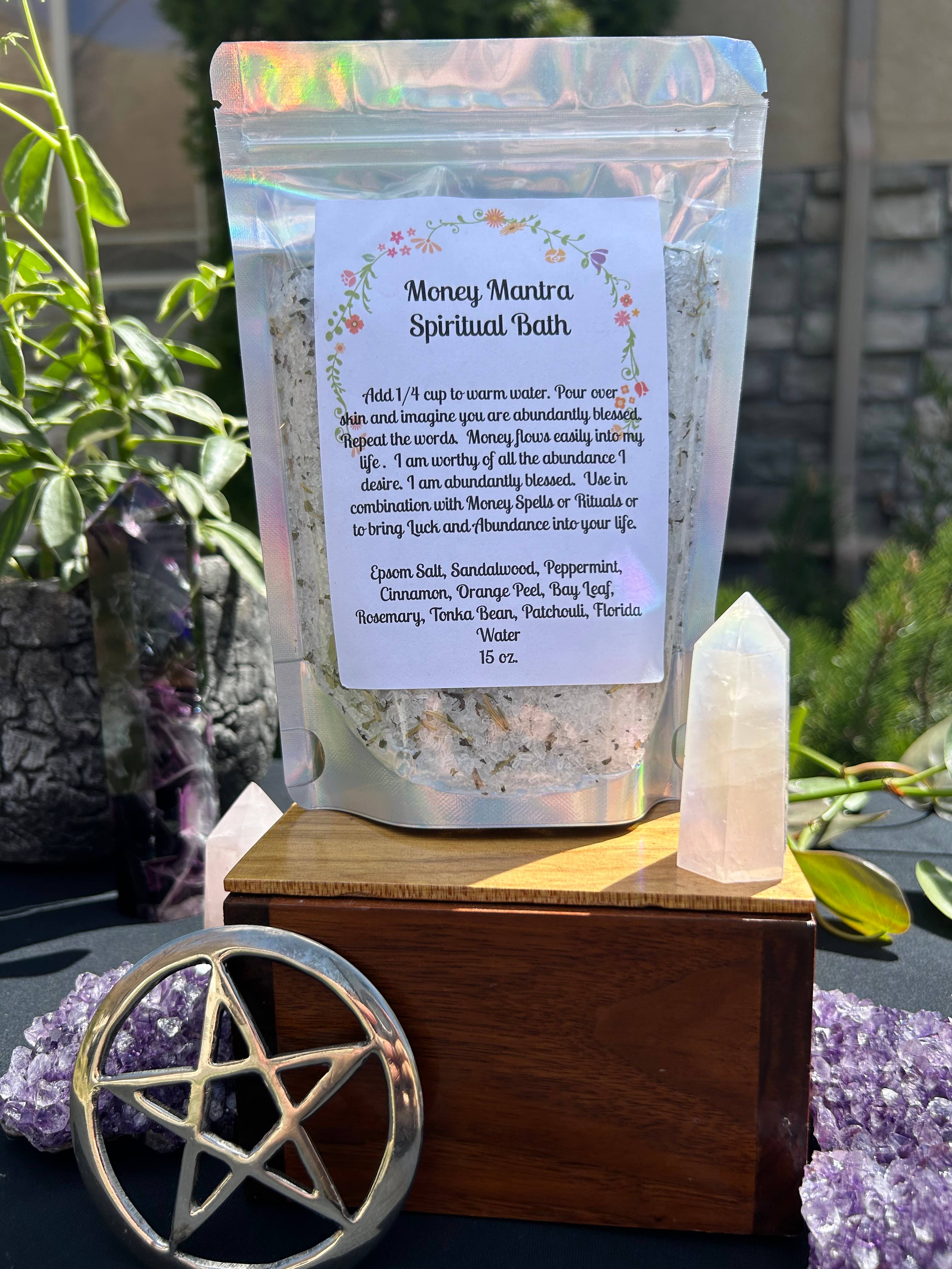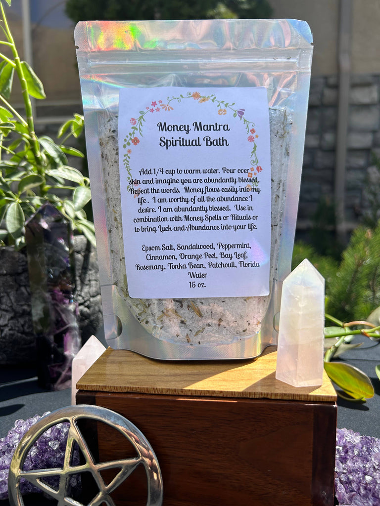 Unlock the flow of abundance and prosperity with our Money Mantra Spiritual Bath. This specially crafted 15 oz bath blend is infused with powerful herbs, essential oils, and an empowering mantra to attract wealth, success, and positive energy into your life. Whether you're seeking financial growth, career advancement, or the manifestation of your dreams, this bath ritual is designed to help align your energy with the vibration of abundance. Feel the shift as you cleanse and recharge with each use.