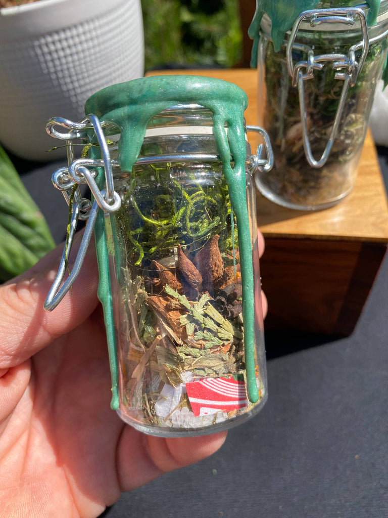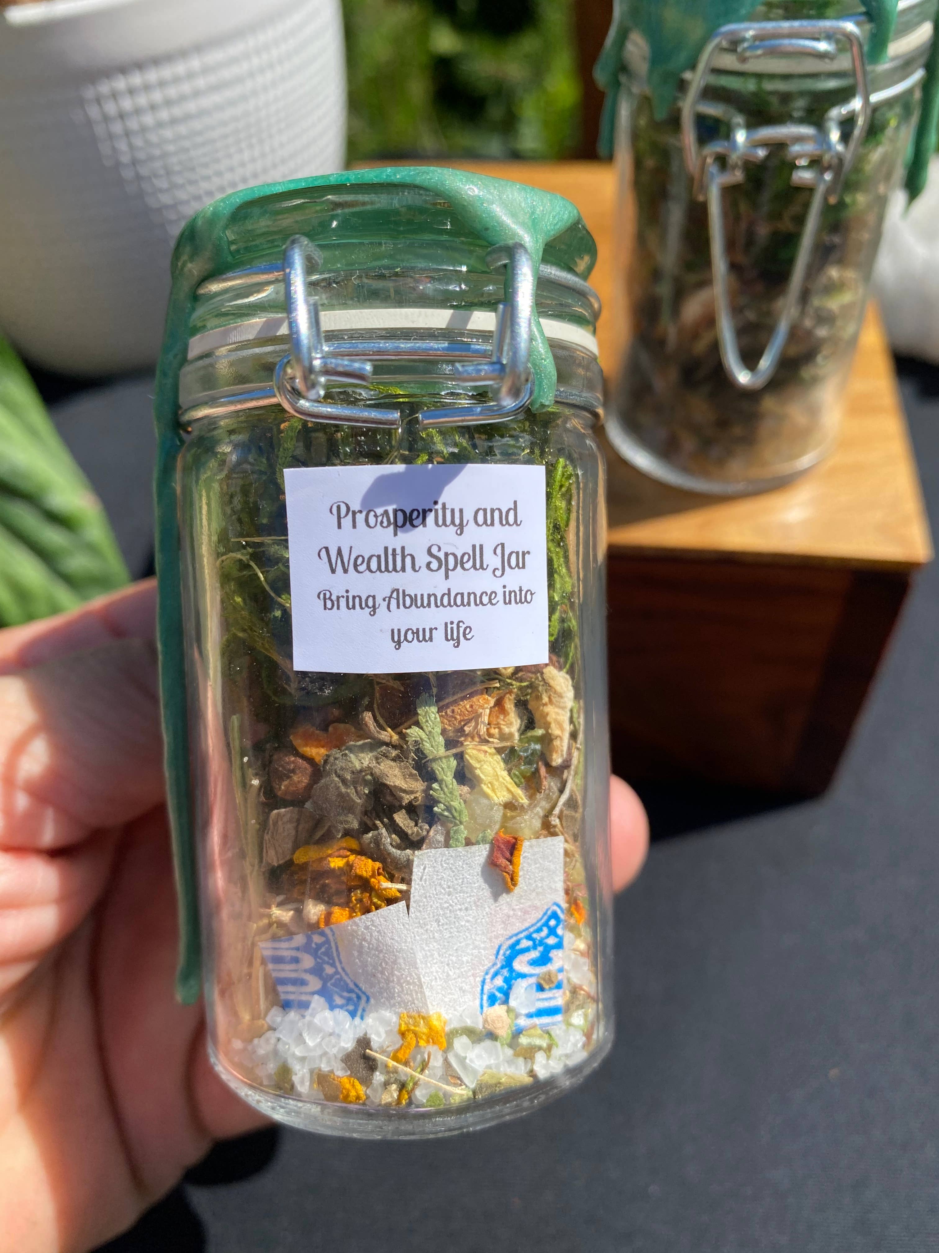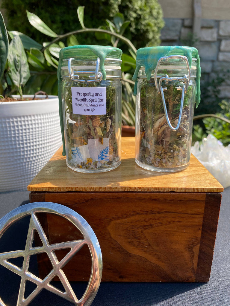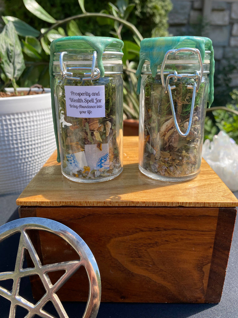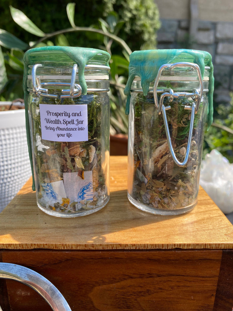 Each spell jar is filled with herbs, flowers, prosperity oil, crystals and all my intentions. Each Spell Jar may vary slightly because each is handmade. Each jar is hand sealed with wax so color may vary slightly from picture. Jars have a resealable snap top closure and removable labels.