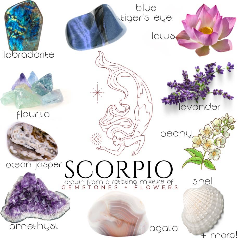 These special Scorpio crystal aromatherapy candles are a thoughtful gift for any occasion. Now available in 2 sizes- Small 4oz travel tin or 8oz Full size tin. Our candles are hand poured with organic soy candle wax and a blend of grade A therapeutic essential oils, featuring our Water Aromatherapy blend- Water: Black Coral + Moss w/ Rose + Sandalwood Note Profile Top: Marine, Camphor, Pineapple Middle: Lavender, Bamboo, Rose Base: Dark Musk, Amber, Vetiver, Cedar, Sandalwood Rose petals, lavender buds and Reiki charged crystals top off each special candle. We draw from a rotating mixture of genuine gemstones and minerals, intuitively chosen for Scorpio, including quartz wands, rose quartz, tiger’s eye, rhodochrosite, druzy, amethyst and pieces of shell. The cap closure of the candle is adorned with a label featuring original Scorpio art completed by Melodia in 2020. Each candle comes with a cute personalized card detailing Scorpio strengths.