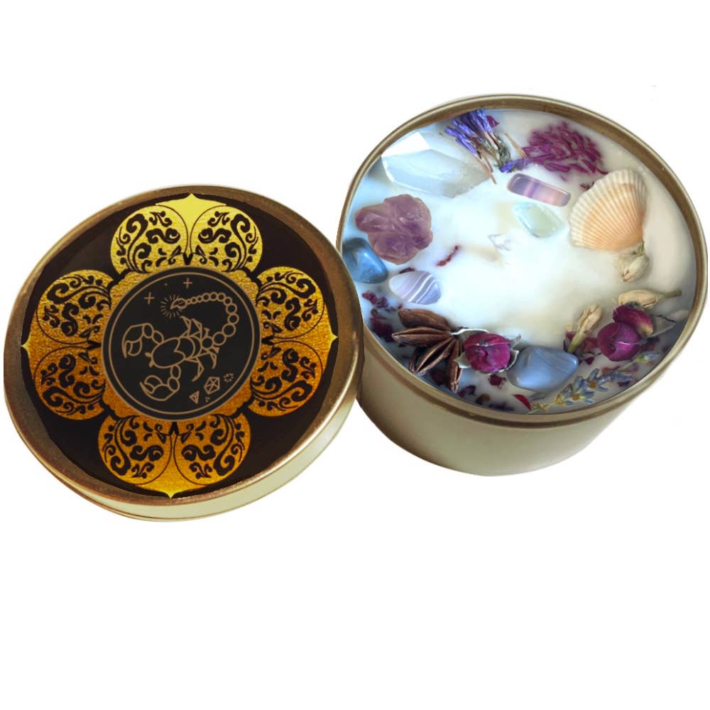 Scorpio Crystal Candle, Zodiac Candle w/ Gemstones + Herbs: 4 oz. travel tin