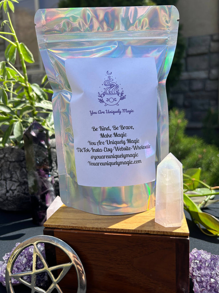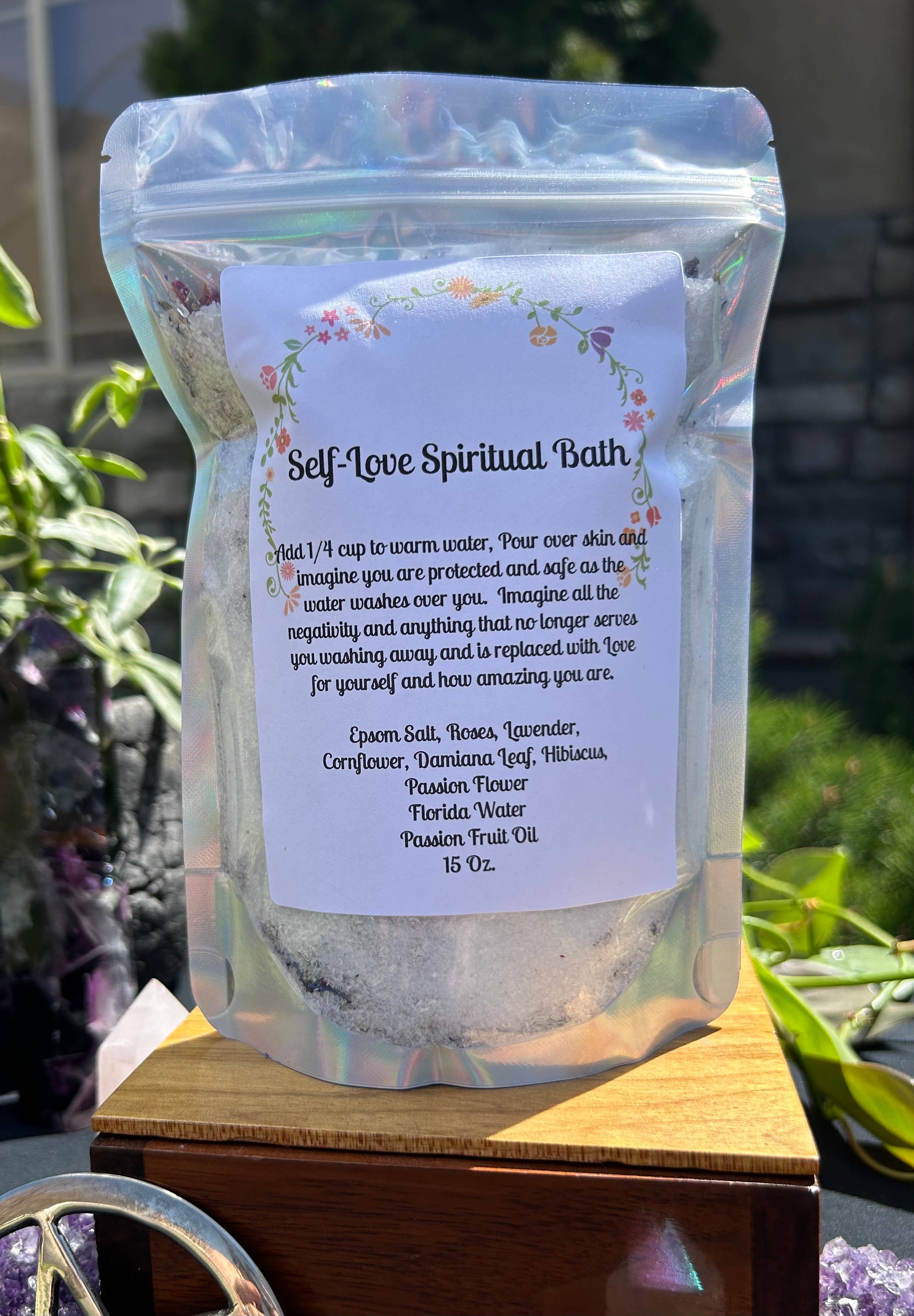 Sprinkle about 1/4 cup self love spiritual bath under running warm water. Relax into the bath, imagine a bubble of love and protection surrounding you. pour the bath water over your skin with intention, imagining all your worries and stress melting away and filling you with beauty and love for yourself.