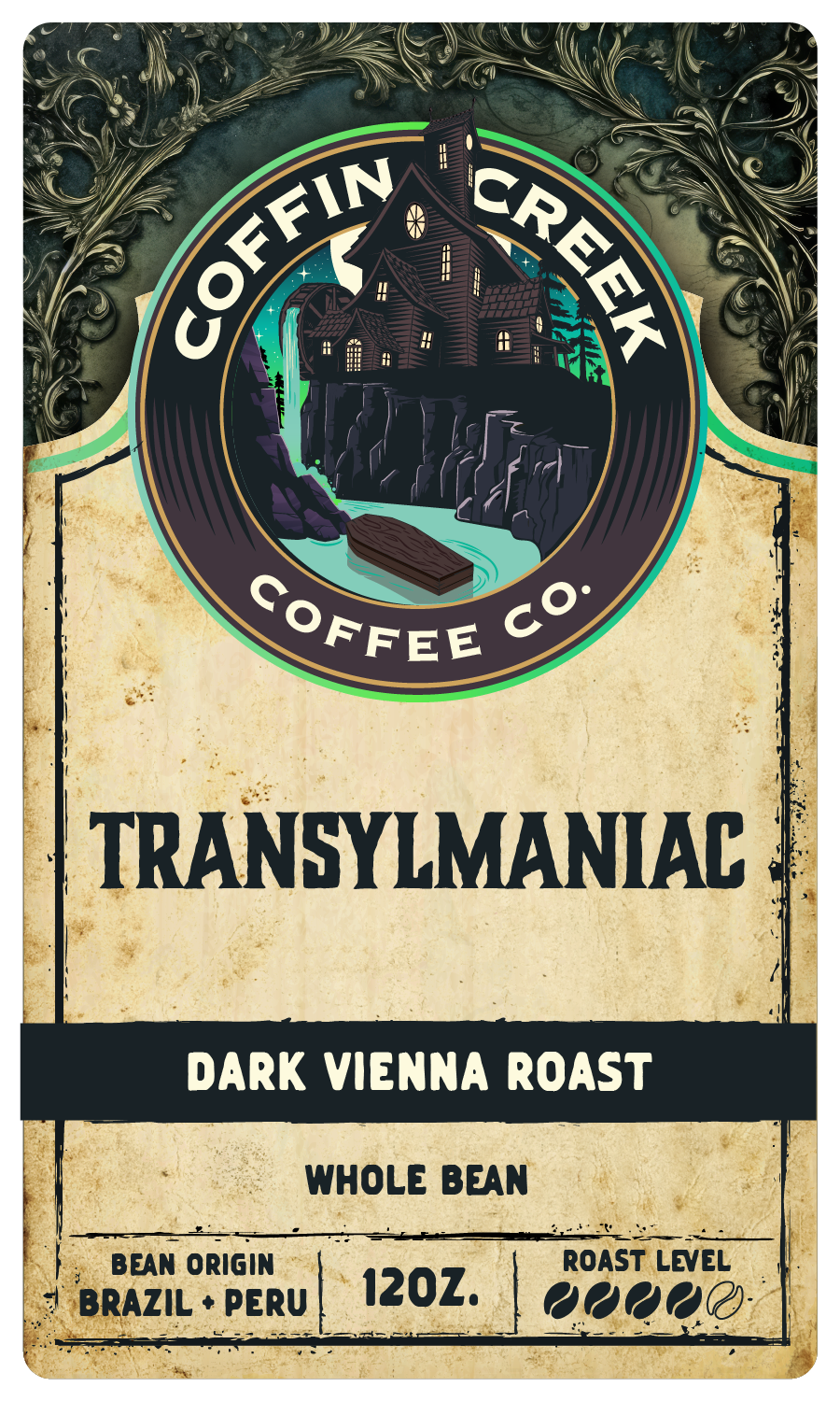 Our Transylmaniac roast embraces the balance of dark richness and subtle light oils, delivering a bold and robust coffee experience that’s anything but ordinary. This blend is a tribute to our commitment to both quality and community, with $1 from each purchase supporting Rainbow Road, an LGBTQIA2S+ charity. The captivating label, crafted by Lee Howard and designed by Joanne and Bill Howard from Small Dog Designs, perfectly complements the mysterious and delightful brew within. Enjoy a cup that’s as deep and satisfying as a midnight stroll through Coffin Creek.